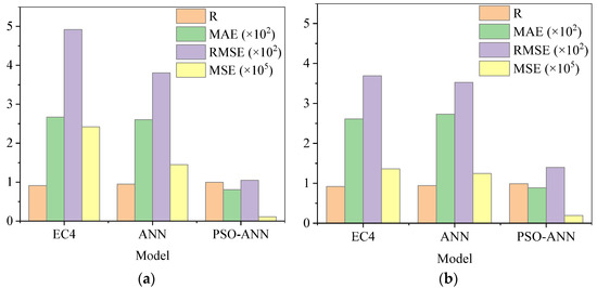 - The prediction performance of the PSO-ANN model proposed is superior to that of the EC4 and original ANN model with regard to the R, MAE, RMSE, and MSE.