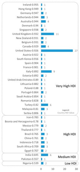 To investigate the consideration of environmental sustainability in commercial and residential buildings, the findings from the first stage of the Survey were used (see Table 2). The Ideal and Typical/Usual Environmental Sustainability weights of buildings associated with different countries were obtained. These sustainability weights were then rationalized based on the level of human development and environmental performance of different regions. This was because, on the scale of countries, different drivers influenced the regional attention towards sustainability dimensions. Human needs have varying priorities; for instance, if issues of inequity, health, poverty and illiteracy were taken into consideration, it could be argued that the focus of sustainable development in developing countries should be on socio-economic issues rather than on the environmental [47,48]. Accordingly, developing and developed countries have different preferences toward sustainability [47,49]. Hence, the distribution of countries into various groups while presenting the survey findings would help to see the priorities currently given to environmental sustainability in buildings by countries having different degrees of human development. To determine the level of human development in different regions, the measure used in this study was the Human Development Index (HDI), a United Nations measure of well-being in a country, which can help rank countries by their level of human development. The HDI is a composite statistic of education, life expectancy and income per capita. A country gets a higher HDI score when education level, lifespan and GDP per capita are higher, and inflation and fertility rates are lower. Notably, countries with an HDI value above 0.8 are considered to have very high HDI values. An HDI value above 0.8 is classified as very high, between 0.7 and 0.799 as high, 0.55 to 0.699 as medium, and below 0.55 as low [50]. This criterion was used to segregate, analyze and rationalize the survey findings related to the first objective.