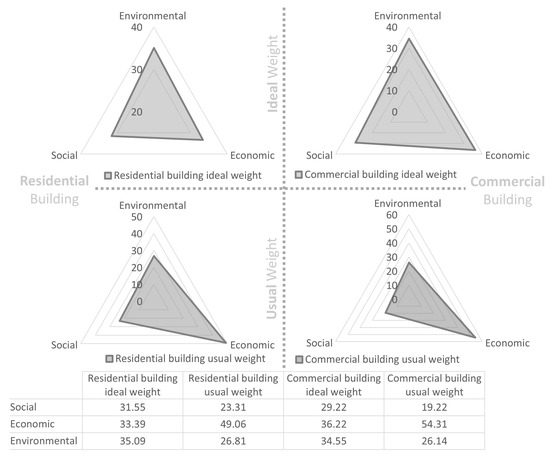 Sustainable development is about satisfying human needs by adhering to socio-economic and environmental values [47,52]. For a building project to be regarded as sustainable, all three sustainability dimensions need consideration [30]. Average weight values of the sustainability dimensions from all the survey responses are provided in Figure 2, which indicates the average trends towards social, economic and environmental sustainability in residential and commercial buildings. As shown by the radar charts in Figure 2, the most balanced weight values for the three sustainability dimensions are only for ideal residential and commercial building scenarios. In the case of usually assigned weights for commercial and residential buildings, much higher weight values are associated with the economic dimension compared to the environmental and the social dimensions. All three sustainability dimensions belong to a cohort, following a zero-sum approach which implies that an increase in the weight of one dimension decreases values for the other two dimensions. Based on analysis (see Figure 2), currently, in the building sector, social and environmental dimensions are dominated by their economic counterpart, and the survey participants have idealized that all three dimensions in the building sector should receive somewhat similar scores.