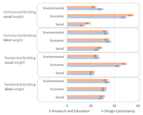 The difference in sustainability dimension weights can originate on the micro-level because of the difference in views of different project stakeholders and on the macro-level because of the difference in the regional policies. The disparity in expert opinions is analyzed in Figure 3, which shows the weights of sustainability dimensions with respect to respondents’ professional affiliation. The survey respondents belonged to Research and Education (n = 87), Design Consultancy (n = 23), Construction Consultancy (n = 5) and other construction-related professions (n = 5). Owing to the significant representation of Research and Education (n = 87) and Design Consultancy (n = 23) professions in the dataset, only their responses are presented in Figure 3. For ideal weights of residential and commercial buildings, respondents from both professions assigned roughly equal weights to all three dimensions. A slight difference in weights with respect to professional affiliation is observed in the case of the usual weights of commercial buildings. Compared to the professionals from Research and Education, those from Design Consultancy tend to associate slightly less weight with Social and Economic sustainability, but slightly more weight with Environmental sustainability. A detailed discussion regarding the social and the economic sustainability dimension in buildings and the indicators and the parameters associated with social and economic sustainability is beyond the scope of this paper, and it has been addressed by authors elsewhere [7,8].