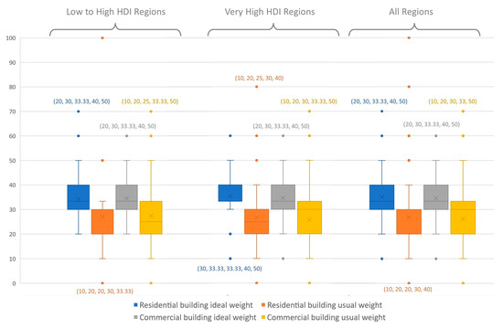 Respondents were asked about the relative weight of sustainability dimensions from the perspective of their countries. To investigate the regional trends, the survey data was segregated based on HDI estimates of 2019 [54]. This division helped to rationalize the weight distribution from the viewpoint of regional development. For the Survey conducted in this study, most of the participants belonged to highly developed regions (n = 92); hence the environmental sustainability weights they indicated were for countries with very high HDI. For countries with high, medium and low HDI values, 19, 6 and 3 responses were obtained, respectively. Owing to the relatively lesser number of responses for high, medium and low HDI value countries, the responses for these three groups of countries were collectively presented within the group of low to high HDI countries. Figure 4 presents the box whisker plots of environmental sustainability weights for buildings in countries with low to high and very high HDI values. Based on the median values as shown in five-number summaries, it can be deduced that very high HDI countries typically tend to give relatively more attention to environmental sustainability for residential buildings (Median = 25) and commercial buildings (Median = 30), compared to the weights typically given to residential buildings (Median = 20) and commercial buildings (Median = 25) in low to high HDI countries.