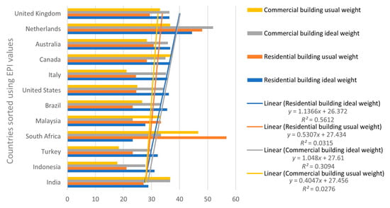 Among the countries included in the analysis, India has the lowest EPI score (27.6), and the UK has the highest EPI score (81.3). The linear trend lines provide an understanding of overall tendencies. The ideal weight of both residential and commercial buildings significantly increases from low to high EPI countries with a slope value of 1.136 and 1.048, respectively. However, the typical weight of residential and commercial buildings slightly increases from low to high EPI countries with a slope value of 0.53 and 0.40, respectively.