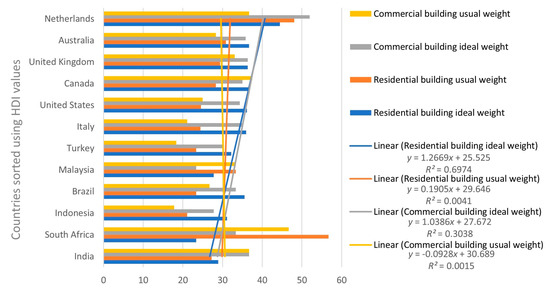 The bar chart in Figure 6 establishes trends in the weights upon sorting the responses in the descending order of the HDI values of countries for which responses are provided. With India having the lowest HDI value (0.645) and the Netherlands having the highest (0.944) of the regions considered for analysis, the linear trend lines provide an understanding of overall tendencies. The ideal weights of both the residential and commercial buildings have trend lines showing significant weight increase from low to high HDI value countries with a slope value of 1.27 and 1.04, respectively. On the contrary, the usual weights of residential and commercial buildings have trend lines showing very slight differences in weight among low and high HDI value countries with slope values of 0.19 and −0.09, respectively. The environmental sustainability weights, along with the EPI score and HDI value of respective countries (listed in Figure 5 and in Figure 6), are shown in Table 3.