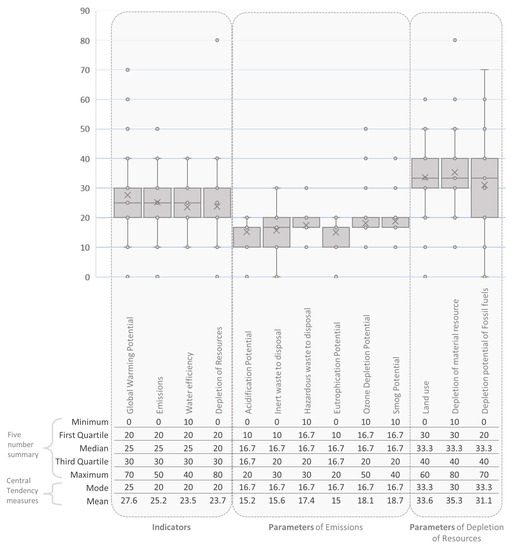 The weight values assigned by survey participants in this study are somewhat symmetric, which means that among the various indicators and parameters of environmental sustainability, somewhat similar weights were assigned. Although a big difference in assigned weights is observed from the five-number summary (see Figure 7), the mean weight values in many cases are close to each other and give the appearance of symmetrical distribution. Since indicator and parameter weights were not inquired for individual regions, these weights from Survey have not been explained using the regional affiliation of survey participants.