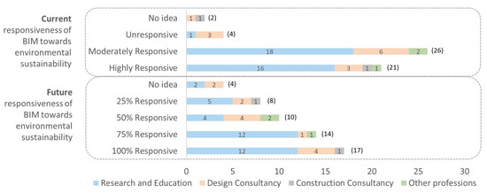 Figure 9 explains the respondents’ choice for BIM’s current and futuristic responsiveness in the context of their professional affiliation (research and education, design consultancy, construction consultancy and others). For the question of current BIM responsiveness towards environmental sustainability, a higher proportion of respondents belonging to research and education opted for highly and moderately responsive choices. Based on the analysis, it can be concluded that in comparison with ‘unresponsive’ and ‘no idea’ choices, the significant majority of respondents for ‘highly responsive’ and ‘moderately responsive’ choices belonged to the ‘research and education’ area, therefore making these selections hardly contestable. For the question of futuristic potential responsiveness of BIM towards environmental sustainability, not only a high number of respondents is noticed in the case of ‘100% responsive’ and ‘75% responsive’ choices, the proportion of respondents from research and education in both these cases was approximately 70%. This gives credibility to these response choices, and the findings can be picked by BIM developers as a roadmap for future growth.