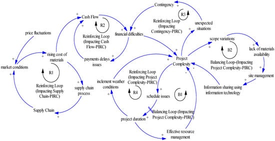 In this phase, various CLDs were created, and ST and SD analyses were conducted accordingly. In order to create a CLD, the data is gathered in the form of expert opinions. Interviews with industry professionals, with an average of over 20 years of experience, were performed during the first phase. These respondents were working for client, contractor, designer, and consultant companies, each with their own tasks and responsibilities. There were project team leaders (4), contract and procurement experts (2), construction managers (3), planning engineers (2), and site engineers (4), among the most important positions. This step aimed to recognize linkages between variables and give polarity to relationships between the most direct causal links in chronological order, following relevant studies [37]. Using this information, a CLD was created that revealed six major loops.