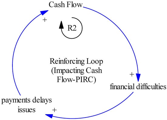 The current study’s findings show that the rising cost of materials, supply chain issues, payment issues, planning and scheduling issues, financial difficulties, and ineffective control of manpower and equipment resources are the most critical PIRFs that have a causal impact on construction profitability. The interrelationships between these PIRFs, and the associated four PIRCs, are established through ST. These are iterated and quantified through SD modeling. A total of six causal feedback loops are developed here, in which four loops are reinforcing, i.e., R1 to R4, and two loops are balancing, i.e., B1 and B2. Overall, loop R2, dealing with the PIRC “cash flow,” is considered critical because it has a strong, fast, and reinforcing influence. R1, R3, and R4 are the least important loops, followed by B1 and B2.