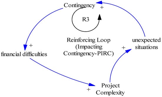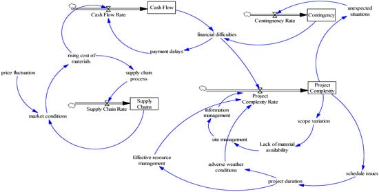The quantification of the integrated influences of variables in causal feedback loops is achieved through the SD tool (Vensim). These are converted into stocks (PIRC) and flows (PIRF) diagrams. The SD integrated impacts of PIRFs on PIRCs follows the pattern of “cash flow (74.18%),” “project complexity (52.26%),” “contingency (17.22%),” and “supply chain (14.21%)”.