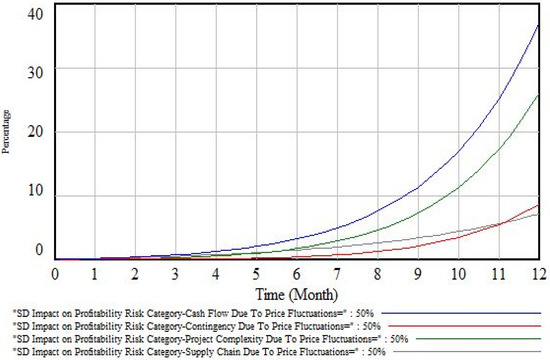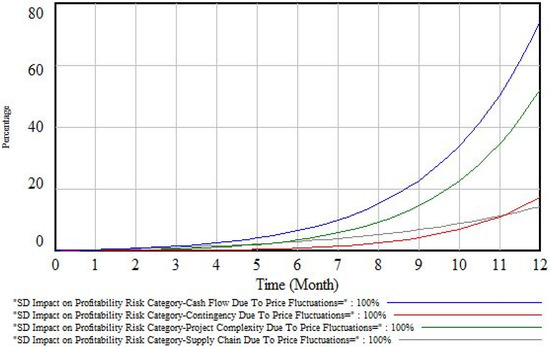 Similarly, the simulation values for 20% price fluctuations are 13.70% and 5.81%, respectively. In future studies, any effect in the system can be observed for any discrete period, and simulation results can be obtained and compared for specific data sets for all causal links using the developed SD model. Accordingly, all loops can be highlighted and explored to judge the causative qualitative and quantitative impact values of PIRFs and PIRCs for construction projects.