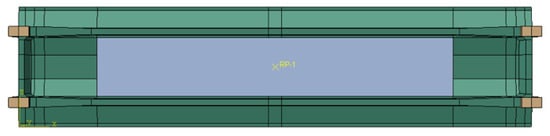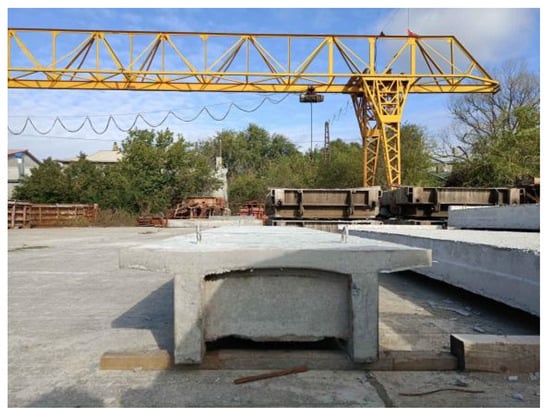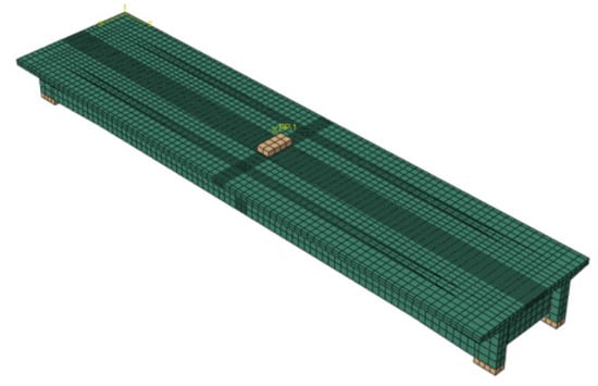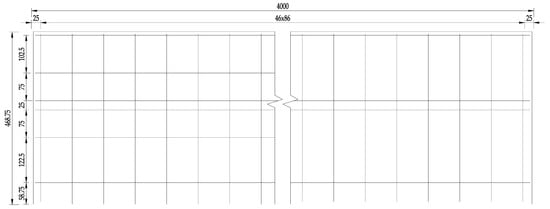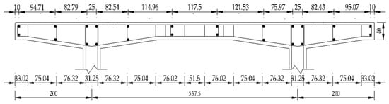 Based on the design drawings of the 16 m rib beam bridges in Standard Drawings for Highways and Bridges formulated by the Expert Committee of the Ministry of Transport of the People’s Republic of China [], the test model of the double T-beam bridge slabs was established in this paper. The model of bridge slabs and its transverse and longitudinal reinforcement are shown in Figure 1, Figure 2 and Figure 3.