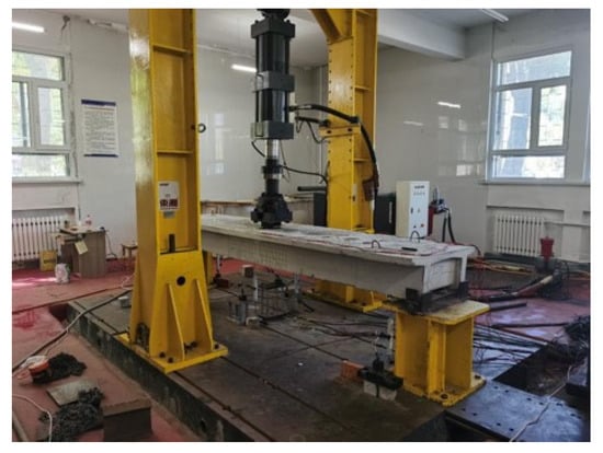 First, static load tests were carried out on P1. A PLS-500 electro-hydraulic servo dynamic and static test machine (manufacturer DOCER, country China, city jinan in shandong province) was used as the loading device. Multi-stage loading and three-point bending were adopted in the test. The loading conditions at the testing site are shown in Figure 6.