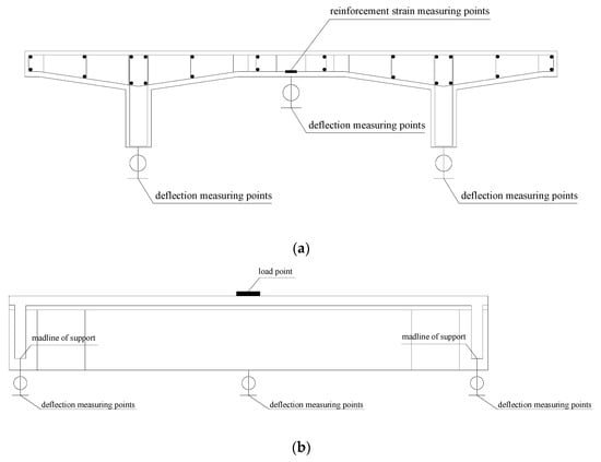 The arrangement of the deflection measuring and reinforcement strain measuring points. (a) Front view. (b) Side view.