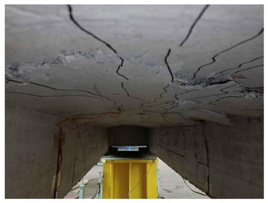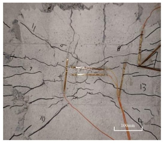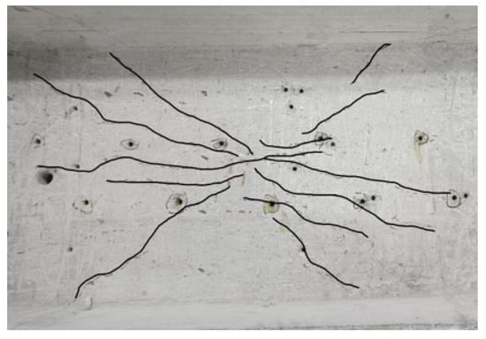 Fatigue damage tests were carried out on P3. Constant amplitude-controlled loading was adopted in the test, the waveform was a sine wave, and the fatigue-loading frequency was 3.8 Hz. The lower and upper limits of the fatigue load were 15 kN and 75 kN, respectively. According to the P2 fatigue damage development, the fatigue damage of P3 was controlled in the steady development period of damage, and the fatigue cycles of P3 were finally determined to be 500,000 cycles. After damage, the maximum crack width of P3 at the slab bottom was 0.26 mm. According to the definition of damage degree (D) in the Palmgren–Miner linear damage degradation formula, D = Nt/Nf, where Nt and Nf are the cycles of the fatigue load and fatigue life of the bridge slab. Through the calculations, the damage degree of P3 was 0.3086, and its fatigue damage modes are shown in Figure 9.