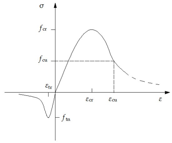 where σ and represent the tensile (compressive) stress and strain of concrete, respectively; and represent the shape parameters of the descending section of the concrete curve determined according to the Code for Design of Concrete Structures []; represents the residual strain of concrete after fatigue cycles of Nt, and fcu, ftn, , and represent the corresponding residual compressive strength, tensile strength, peak compressive, and tensile strains of concrete after fatigue cycles of Nt.