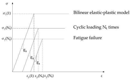 According to Li [], under the action of high-cycle fatigue, the stress level of the steel bar is usually low, its stress and deformation are basically in the elastic stage, and the steel bar will not reach the yield strength. The fatigue failure of steel bars is a transient fracture due to the failure of the residual effective bearing area under tensile load. In addition, Zhu [] and Zhu and Yan [] used the bilinear elastic–plastic model of reinforcement to simulate the fatigue damage of the reinforced concrete rectangular beam and bridge deck, respectively. The results showed that the simulated value was in good agreement with the test value curve, and the maximum error was less than 10%.