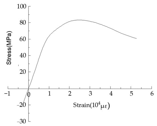 In the initial loading stage, the compressive stress–strain curve developed from linear to nonlinear, and the peak compressive strength and strain were 83 MPa and 25,406 , respectively. In the later loading stage, the compressive stress–strain curve was nonlinear, and the strain at failure was 52,776 . The tensile stress–strain curve was almost linear, and the peak tensile strength and strain were 21.9 MPa and 3258 , respectively. The relationship curve was fitted, and the constitutive relationship of the polyurethane concrete can be calculated using Equations (18)–(21):