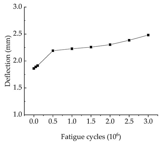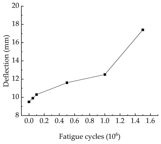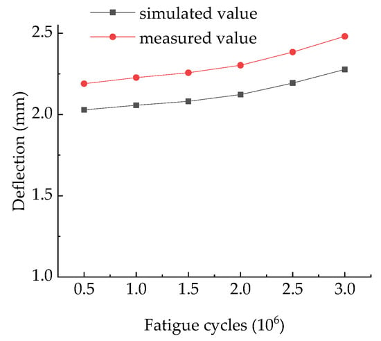 Under the test condition of the reinforced P3, the fatigue damage of the reinforced bridge slab was simulated. At the initial stage of fatigue, the fatigue damage of the bridge slab was small, and there was no obvious difference when compared with the undamaged bridge slab. Therefore, the simulation in this paper started from 500,000 cycles. The simulated mid-span deflection obtained from the finite element model was compared with the measured deflection obtained from the actual tests to verify the validity of the finite element analysis. The comparison of the deflection between the measured and simulated values is shown in Figure 23.