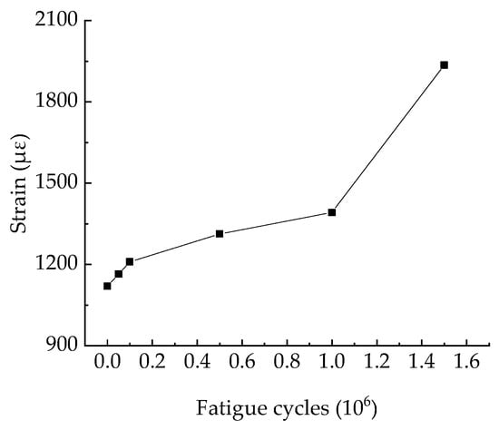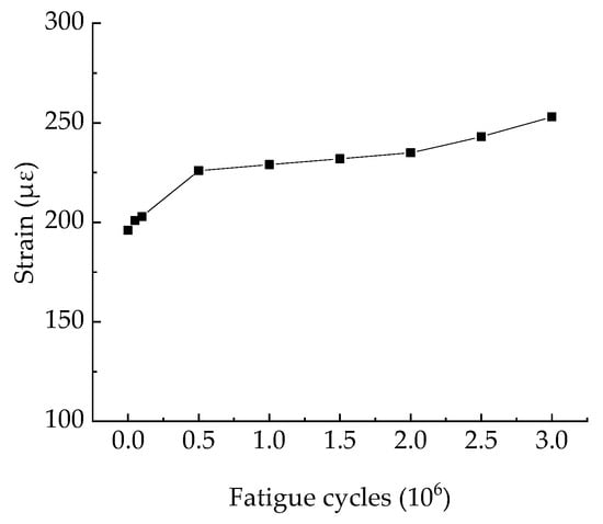 According to the Standard for the Test Methods of Long-term Performance and Durability of Ordinary Concrete [], the test can be terminated if the specimen is not damaged after 2 million loads. To explore the fatigue performance of reinforced P3, the fatigue cycles were extended to 3 million cycles. The arrangement of measuring points and the fatigue cycles of collected data were the same as P2.