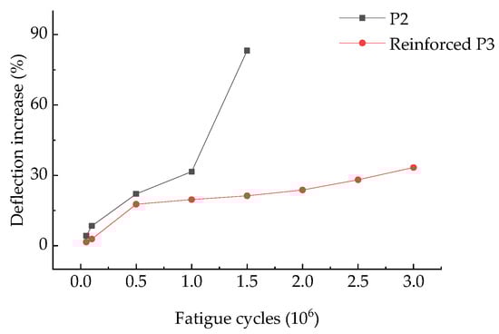The relationship between the increase in the mid-span deflection and fatigue cycles of P2 and the reinforced P3 is shown in Figure 22.