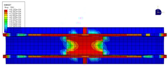 The damage nephogram of the S1 model after 2 million fatigue cycles, the relationship between the residual ultimate load capacity and damage degree, and the relationship between the mid-span deflection and damage degree are shown in Figure 24, Figure 25 and Figure 26.