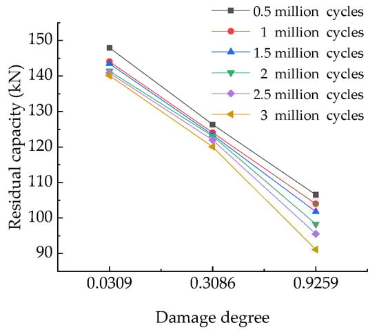 The results showed that there is an exponential relationship between the damage degree and residual ultimate load capacity under different fatigue cycles. The regression equation between the residual ultimate load capacity and damage degree was established