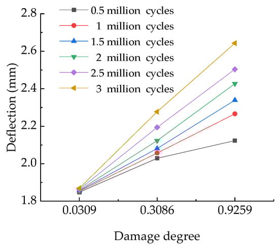 The results showed that the development trend of the fatigue damage in the numerical simulation was consistent with that in the actual tests, which is in line with the two-stage development law of the fatigue damage in the actual tests when the fatigue cycles ranged from 500,000 to 3 million cycles. When the fatigue cycles reached 3 million, the difference between the simulated deflection (2.277 mm) and the experimental deflection (2.48 mm) reached the maximum, and the relative error was 8.95%, which was within the acceptable range. Thus, the validity of the finite element model proposed in this paper was verified.