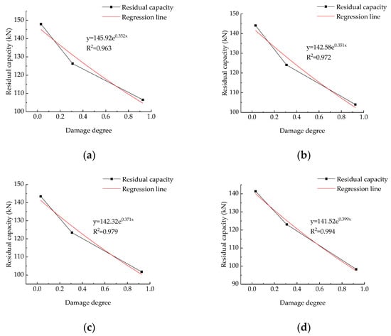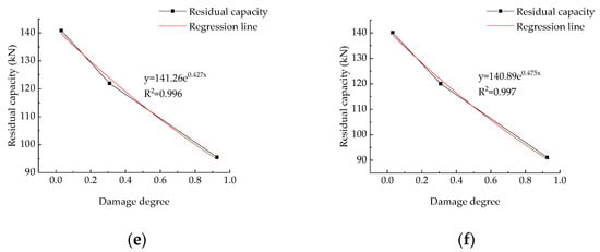 The relationship between the damage degree and the residual ultimate load capacity under different fatigue cycles. (a) 0.5 million cycles; (b) 1 million cycles; (c) 1.5 million cycles; (d) 2 million cycles; (e) 2.5 million cycles; (f) 3 million cycles.