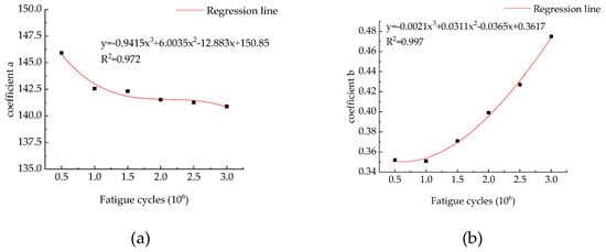 Regression analysis was performed on coefficients a and b under different fatigue cycles, and Equations (23) and (24) were obtained. The relationship between the different coefficients (a and b) and fatigue cycles is shown in Figure 28.