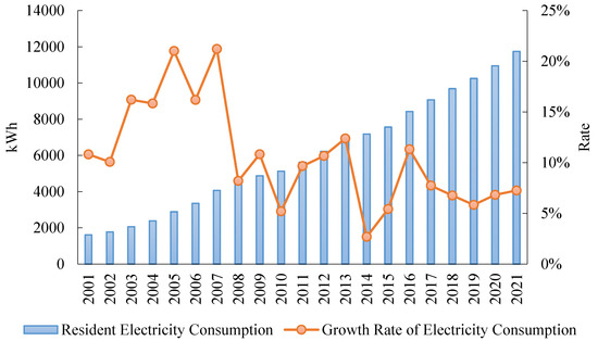2001–2021 China resident electricity consumption and growth rate. Data source: China National Bureau of Statistics.