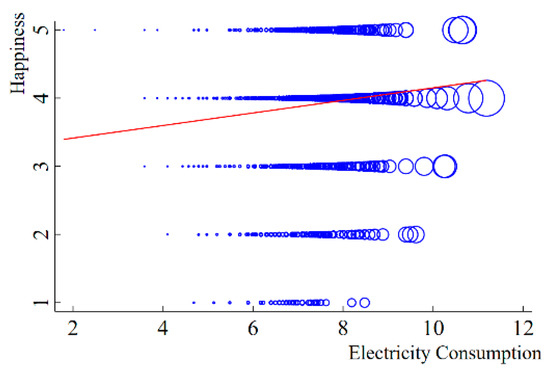 In this paper, the control variables are divided into three levels: The first is individual characteristic variables, including age, gender, education level, marriage status, political affiliation, residence account, and nationality; the second is individual working variables, including labor contract, type of working unit, and job position; the third is family characteristic variables, including house, residential area, car ownership, family size, annual household income, and annual household expenditure. Figure 2 shows the nuclear density diagram of the normal distribution of residential power consumption, which clearly reflects that most of the monthly electricity consumption of Chinese residents is concentrated in the range of 50 kWh to 250 kWh. Figure 3 shows the bubble fitting diagram of Chinese residents’ electricity consumption and happiness. This figure reflects that the higher the electricity consumption of Chinese residents, the higher their life satisfaction.