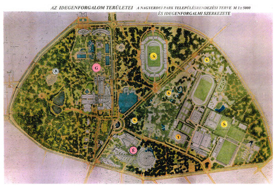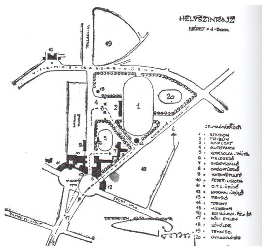 The necessity of implementing some changes was also realized by the local government. The development plan [35] prepared for this part of the city in the mid-1990s formulated some very ambitious concepts (Figure 8): it included the reconstruction of the Great Forest Stadium (S in Figure 8), the construction of an indoor swimming pool (G in Figure 8), thermal wellness and a conference hotel (É in Figure 8), the comprehensive renovation of the athletic center (S in Figure 8), the expansion of the existing sports hotel (T in Figure 8). At the same time, the financial resources necessary for the realization of these plans were rather scarce, and as a result, for a long time, very few of the plans were realized.
