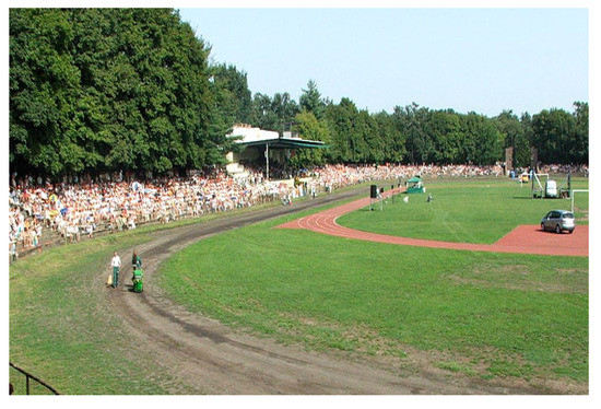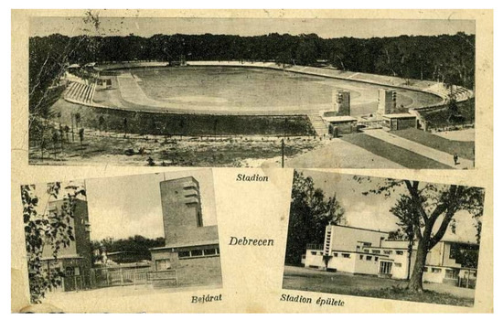 - Sajó, I. The construction of the sports park and stadium of the free royal city of Debrecen. Debr. Képes Kal. 1934, 34, 142–143. (In Hungarian) [Google Scholar]