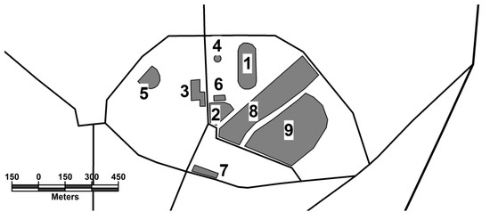 The most important buildings in Great Forest in the second half of the 1980s. Source: own work. (1—stadium, 2—boating pond, 3—bath, 4—water tower, 5—outdoor theatre, 6—new restaurants (Új Vígadó), 7—new hotel, 8—amusement park and zoo, 9—sports park).
