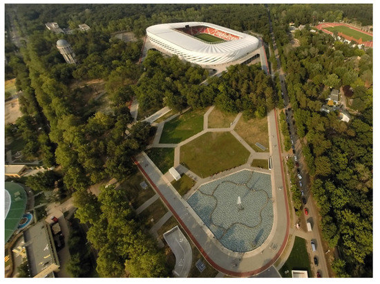 In the spirit of the above, in the course of designing the facility, the plan was to build a “fourth-generation” stadium (the first one of its kind in Hungary) with functions beyond those of a stadium, which would create, by way of the facility itself and its surroundings, such spaces that provide experiences and venues for programmes for the larger public [36,37]. In addition, attention also had to be paid to the protected natural area (the Great Forest park is a NATURA 2000 site), and efforts had to be made to increase the number of parking spots available.