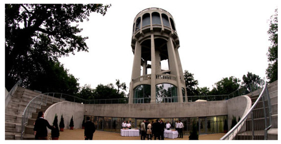Immediately to the north of the stadium (number 4 in Figure 9), a communal and events area has been formed, suitable as a venue for concerts and other events, as well as serving as the location for a mobile ice rink in winter (Figure 12). Along the eastern and western edges of the stadium, the forest park character continues to dominate, with an educational path across the forest and a cross-country adventure course also formed along the eastern boundaries of the facility. As a final step in the development project of the middle part of the Great Forest, the renovation of the Water Tower (number 5 in Figure 9), located in the immediate vicinity of the stadium, was completed in 2018. Now it functions as a café/grill terrace and observation tower, and provides a venue for various cultural events (Figure 13).