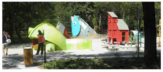 The projects realized in the second part of the 2010s in the western part of the Great Forest Park are also related to the stadium’s development. The elimination of the earlier Boating Pond reduced the surface of the waters, and to compensate for that, the area of the “Békás” pond, located in the middle of this section of the forest, was increased to one and a half times its former size. The water supply was also made more secure (Figure 14, number 6 in Figure 9). The nearby open-air theatre, which was in disrepair, was also renovated (Figure 15); an outdoor gym, educational paths, playgrounds (Figure 16, number 7 in Figure 9), and new promenades were added, and the plants in the park were also renewed.