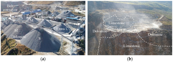 Shiqi aggregate system at WDD hydropower station: (a) Shiqi aggregate field; (b) Shiqi aggregate production system (Note: L is the large stone, M is the medium stone, S is the small stone, Extra L is the extra-large stone).