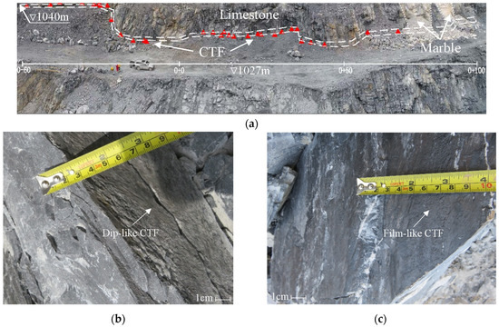 Distribution and present form of CTF in the limestone: (a) Distribution of the CTF; (b) Dip-like CTF; (c) Film-like CTF.