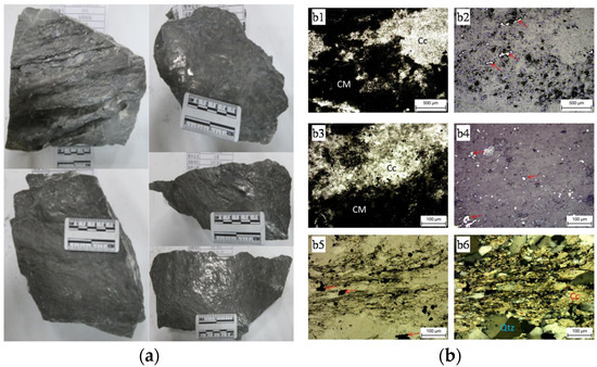 The CTF used in this study was derived from the Shiqi aggregate production system at the WDD Hydropower Station. Based on observation of hand specimens made of the CTF (Figure 3a) and identification of rock slices (Figure 3b), the main properties of the CTF are as follows: (1) The CTF is between 0.005 and 0.1 mm thick, has a certain metallic luster and stains hands, resulting in a slippery feel. (2) The film layer on the rock surface contains a certain amount of carbonaceous material, of content not more than 10%. (3) The carbonaceous material consists of irregularly shaped particles smaller than 5 μm, distributed in the interior of the calcite particles and between the particles. The red arrows in Figure 3b represent pyrite particles.