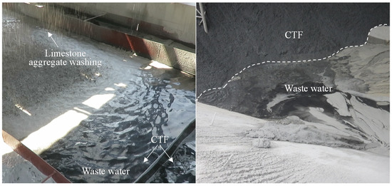 In 2017, after the aggregate production system of the WDD Hydropower Station had produced limestone aggregates, a layer of black grease-stained film material was seen floating on the surface of the wastewater draining from the sand. The main mineral components and chemical composition of this black grease, and the question of whether it will affect the performance of the dam concrete, have received extensive attention. Figure 2a shows the distribution of CTF at EL 1027 m~1040 m at the Shiqi aggregate field. The present form of the CTF is shown in Figure 2b,c.
