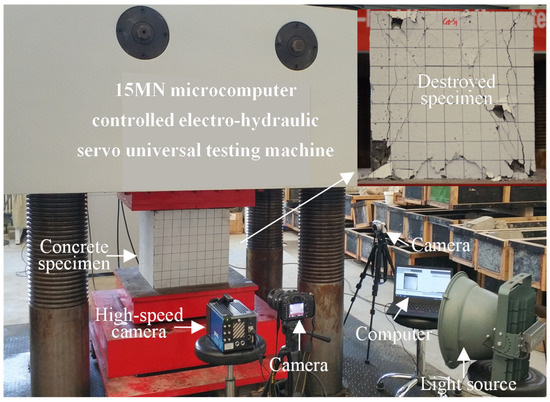 Three specimens were used as a group to test the compressive strength of the four-grade concrete. The test scheme is shown in Table 5. The 15 MN universal testing machine was used to continuously and uniformly load (without impact) at a speed of 6 MPa/min until the specimen was destroyed, and the failure load was recorded (Figure 6).