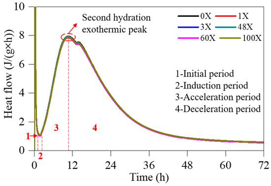 Figure 7 shows the evolution of the heat release rate process from 0 to 72 h, as obtained experimentally from the hydration tests. For different amounts of CTF mixed with a constant amount of low-heat cement and water, the evolution of the overall heat release rate was basically the same, with all curves having the four obvious stages of initialization, induction, acceleration and deceleration. The arrival times and durations of each stage are basically consistent. Based on the experimental analysis results, the following could be observed: (1) at 24 h, the differences between the heat release rates of a pure cement specimen and specimens 1X, 3X, 48X, 60X and 100X were −0.6, −1.2, −0.6, −0.9 and 0.6%, respectively (“−” indicates a lower rate than for the pure cement specimen); (2) at 48 h, the differences in the exothermic rates were −1.5, −1.0, 0.7, −3.3 and 1.1%, respectively; (3) at 72 h, the differences in the exothermic rates were −1.8, −0.7, 1.1, −4.2 and 3.3%, respectively. In summary, the hydration heat release rates were similar for all specimens. With the increase in the content of CTF, the rate of heat release does increase (except for the 60X samples), but the increase is not large. In the final, 72 h, stage, 1X, 3X and 60X showed a relatively reduced rate of hydration heat release, while 48X and 100X showed a relatively increased rate.