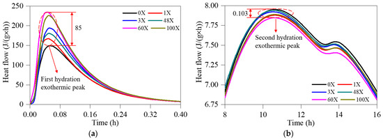 Figure 8a shows the first hydration exothermic peak for each specimen. The first exothermic peak is due to the quick dissolution of aluminate and sulfate [39]. After about 3 min, all specimens, all with different CTF contents, reached the first exothermic peak, but the rate of exothermic heat generation varied greatly for each specimen. At the first peak, the differences in the rate of heat generation between the pure cement specimen and specimens 1X, 3X, 48X, 60X and 100X were 12.0, 30.0, 21.3, 56.7, and 52.0%, respectively. This indicates that the CTF can promote the dissolution of cement and the hydration of C3A in the early stage, and the higher the content of CTF, the faster the rate of hydration heat release. However, increasing the amount of CTF does not proportionally increase the hydration heat release rate.