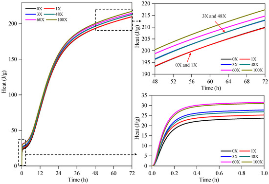 In the initial stage of heat release (within the first hour), the hydration heat release increases with the increase in the CTF content. The cumulative heat releases of the 60X, 100X specimens are the greatest. The pure cement specimen releases the least amount of heat.