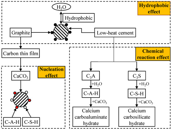 The hydrophobic effect means that, in the low-heat cement hydration process, the graphite present in the CTF retards the cement hydration reaction. The graphite disperses in the cement matrix in a non-uniform manner, due to an aggregation, or collecting together, effect. Because of the hydrophobic nature of graphite, those cement particles aggregating to the graphite have less access to water for hydration reaction purposes [41], thereby reducing the rate of the reaction overall, and resulting in a corresponding increase in the hydration time of the low-heat cement.