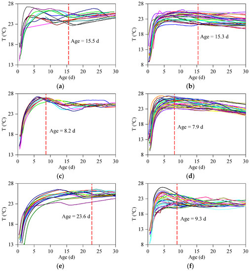 In July 2017, at the commencement of CTF aggregate mining in the WDD hydropower station, the concrete contained more CTF, at a content of about 1X~3X, because improvements to the aggregate’s production and cleaning process had not yet been completed. In April 2019, the intensity of the aggregate flushing process was increased to reduce the CTF content in the concrete (close to 0X) to prevent the CTF from adversely affecting the concrete performance. For this reason, the concrete temperatures during July, August, November and December in 2017 and 2019 were selected when exploring the influence of the CTF on the concrete temperature of the WDD dam. Based on the temperature change curves (Figure 11) and statistics on the highest temperature of the concrete blocks (Table 6), the results show the following: (1) The concrete blocks with a lower CTF content reached their highest temperature at a lower age, with the ages in July, August, November and December being shorter by 0.2 d, 0.3 d, 14.3 d and 17.1 d, respectively. This indicates that the hydration rate of concrete blocks with a lower CTF content was faster. (2) Comparing the years 2017 and 2019, the highest temperatures of the concrete blocks in July and August reached maximum, minimum and average values of 27.3 °C, 25.7 °C and 26.55 °C, versus 27.3 °C, 21.3 °C and 24.84 °C, respectively. The average highest temperature of the concrete blocks in July and August 2017 was about 1.71 °C higher than that in July and August 2019. (3) Comparing the years 2017 and 2019, the highest temperatures of the concrete blocks in November and December reached maximum, minimum and average values of 26.6 °C, 25 °C and 26.09 °C versus 26.76 °C, 20.24 °C and 23.36 °C, respectively. The average highest temperature of the concrete blocks in November and December 2017 was about 2.73 °C higher than that in November and December 2019. The highest temperature of the concrete blocks containing more CTF content (2017) was generally higher than that of the concrete blocks containing less CTF content (2019), which demonstrates that CTF could promote the release of heat from cement hydration.
