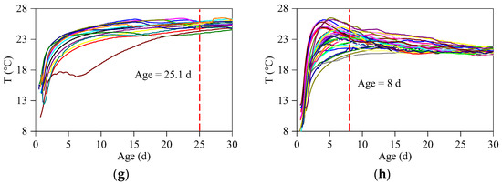 The temperature change curves of WDD concrete blocks: (a) July 2017; (b) July 2019; (c) August 2017; (d) August 2019; (e) November 2017; (f) November 2019; (g) December 2017; (h) December 2019. Note: the ages in Figure 11 are the average age at which the concrete blocks reached the maximum temperature.