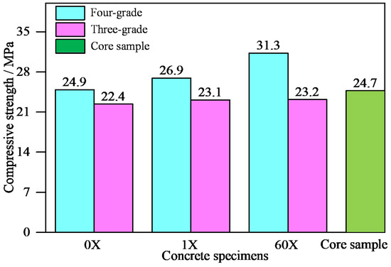 Comparison of compressive strength between four-grade concrete, three-grade concrete and core samples from the WDD dam.