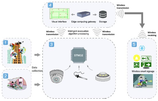 In addition, surveillance camera equipment is covering a more significant proportion of the building area in large public buildings, such as railway stations, airports, stadiums, schools, and hospitals. Some latest surveillance camera equipment can perform intelligent scene analysis, which can output data such as the people count in zones, graphical flame/smoke analysis results, and obstacles blocking evacuation routes. There are two specific data analysis methods: (1) uploading the image data to the cloud/local server in streaming files and performing data analysis on the cloud/local server; and (2) performing “edge computing” data analysis on the camera device, feedback on the abnormal circumstances results, and performing video/image backup storage on the cloud or local server [,]. Furthermore, some scholars are studying how to evacuate effectively in case of sudden power failure of IoT devices when a fire occurs [,,].