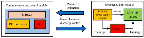 After using the improved cellular automata algorithm to plan the evacuation route on the edge computing platform, the optimal path for evacuation is sent to the back-end emergency signage and lighting system. The emergency signage light guides people based on the route planned by the algorithm. The hardware composition of the system emergency light is proposed based on the original circuit of the traditional emergency light []. Most traditional emergency lights cannot change the evacuation direction on the signage. This traditional signage often features good backup battery design, which can work in power blackouts for several hours. A battery analysis showed that the over 30–50 Ah capacity battery can supply the additional, ultra-low-power 10 mA current consumption IoT circuit with no significant battery lifetime reduction. In this paper, the emergency signage part mainly uses the SI10XX series chip as the core communication and control circuit. The SI10XX is an ultra-low-power single-chip wireless micro-controller (MCU) that is optimized for power supply and meets the power consumption and RF signal transmission requirements of indoor monitoring and security systems. It can collect different voltage parameters in the existing fire emergency light switching power supply. The internal modular composition of the emergency light fixture is shown in Figure 4.